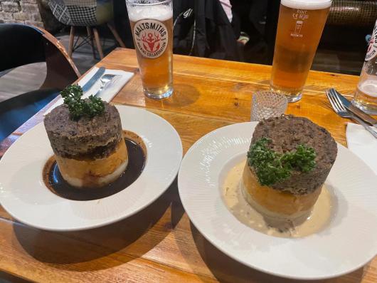 Había hambre y decidimos entrar en un bar que nos había recomendado el guía. Arcade Tabern, en la Cockburn Street 48. Cenamos como no podía ser de otra forma unos Hagis de dos tipos. Los Hagis son el plato típico de Escocia. Son una especie de composición a base de carne de morcilla y distintas verduras. Nos salió la cena por 90 libras (103 euros).